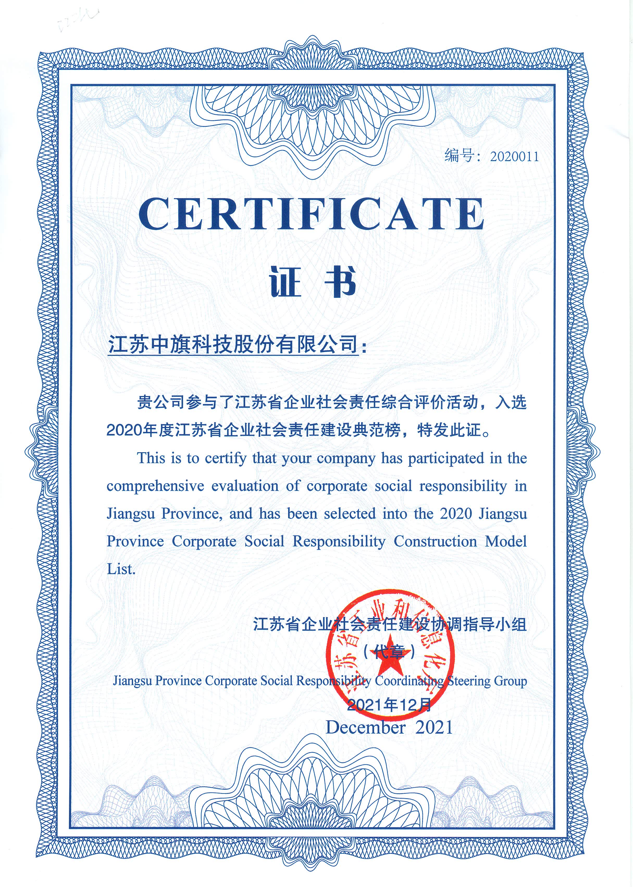近日,江蘇省工業和信息化廳發布《江蘇省企業社會責任建設綜合評價報告(2021)》,以推動相關行業和企業社會責任建設成效獲得更快實質性進展,同時對在社會責任建設與承擔方面工作突出的企業予以表彰。中旗科技榮登“2020年度江蘇省企業社會責任建設典范榜”。